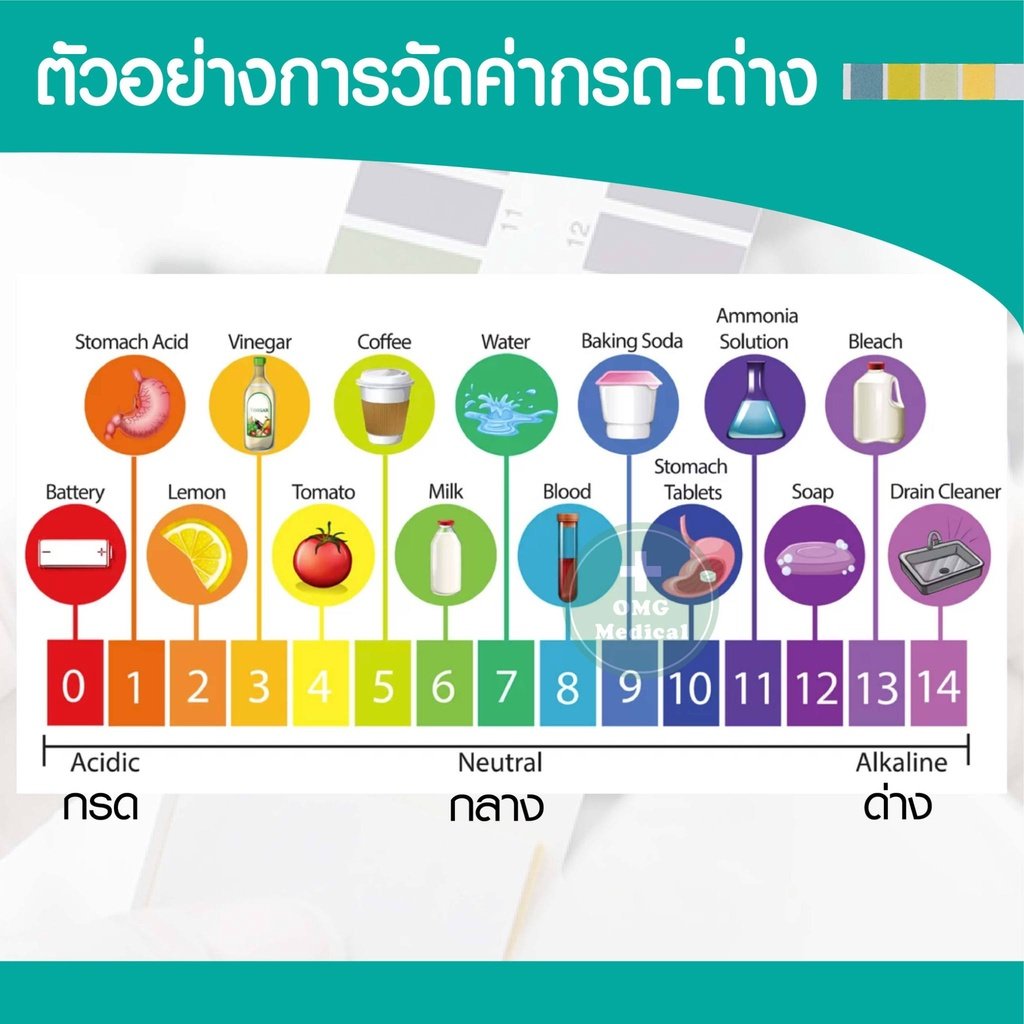 + ผลการทดสอบจะแตกต่างกันไประหว่าง 0 ถึง 14.0 และสามารถจำแนกได้ว่าเป็นกรดเป็นกลางหรืออัลคาไลน์