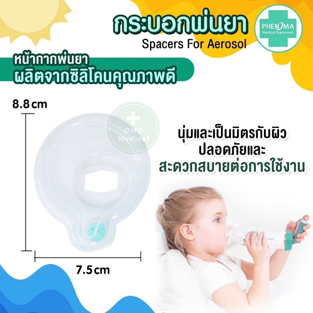 คุณสมบัติ : ช่วยเพิ่มประสิทธิภาพการพ่นยา ชนิด MDI สำหรับผู้ปวยหอบ โรคหอบหืด ที่มีสาเหตุมาจากระบบทางเดินหายใจผิดปกติ ขอบยาง PVC ชนิดใส นุ่ม โค้งรับกับใบหน้า ช่วยให้พ่นยาง่ายขึ้น ยาไม่รั่วไปข้างแก้ม