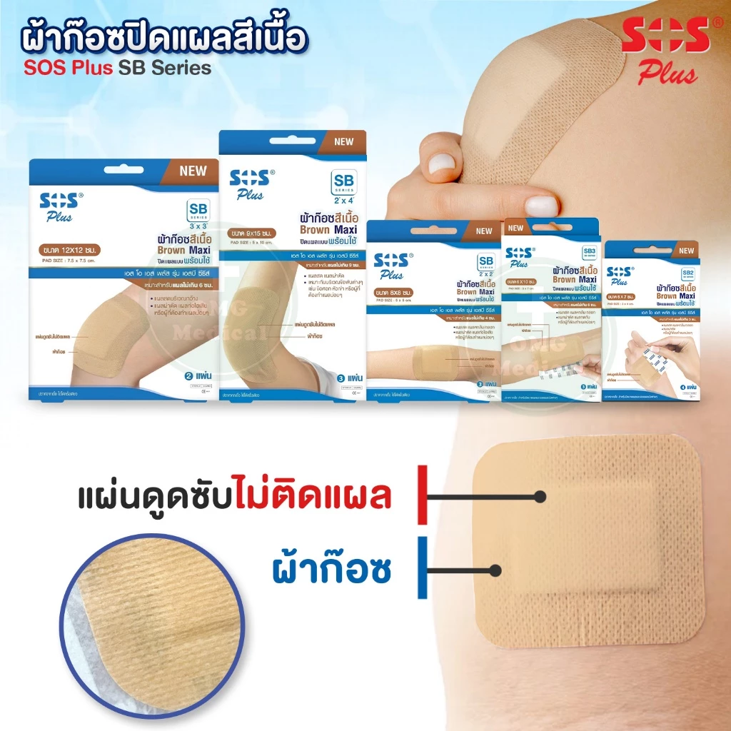 SOS Plus SB-Series ผ้าก๊อซปิดแผล สีเนื้อ Brown Maxi พร้อมแผ่นดูดซับไม่ติดแผล
