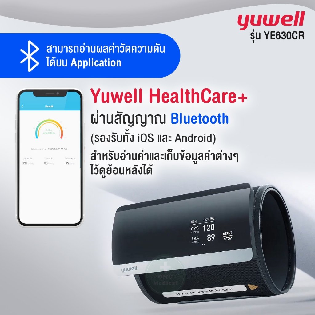 เครื่องวัดความดัน ต้นแขน YUWELL รุ่น YE630CR มีเสียงอ่านค่าภาษาไทย ดีไซน์ใหม่ล่าสุด หน้าจอใหญ่ มองเห็นชัด ไม่มีสายให้เกะกะ วัดค่าได้เร็วกว่าทุกรุ่นที่ผ่านมาของ YUWELL สามารถแสดงค่าการวัดได้แบบเรียลไทม์โดยเชื่อมต่อผ่าน Bluetooth เข้ากับโทรศัพท์มือถือผ่านแอปพลิเคชัน Health Care+ และยังดูค่าการวัดย้อนหลังผ่านแอปพลิเคชันได้ 📲