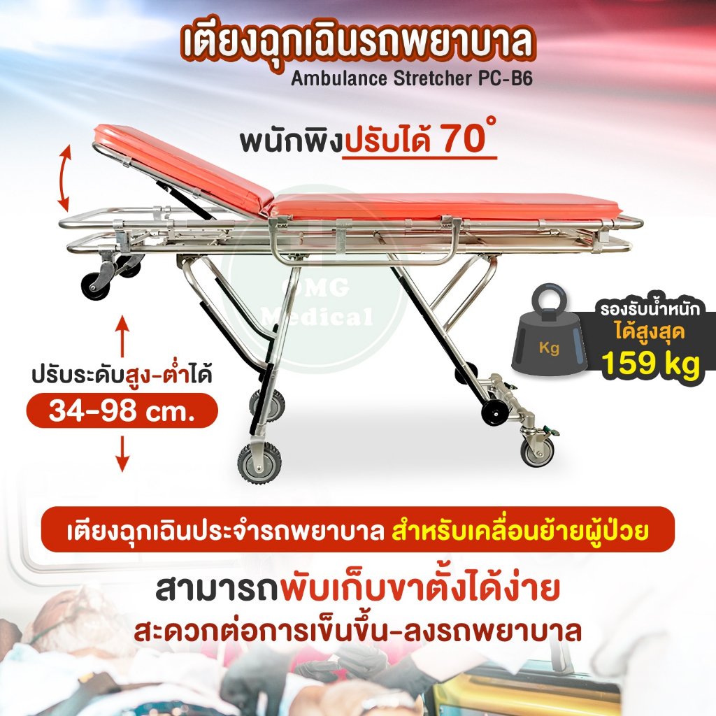 เตียงฉุกเฉินรถพยาบาลรุ่น PC-B6 Ambulance Stretcher เตียงเคลื่อนย้ายผู้ป่วย เตียงกู้ภัย อลูมิเนียม ปรับพับได้ เคลื่อนย้ายสะดวก