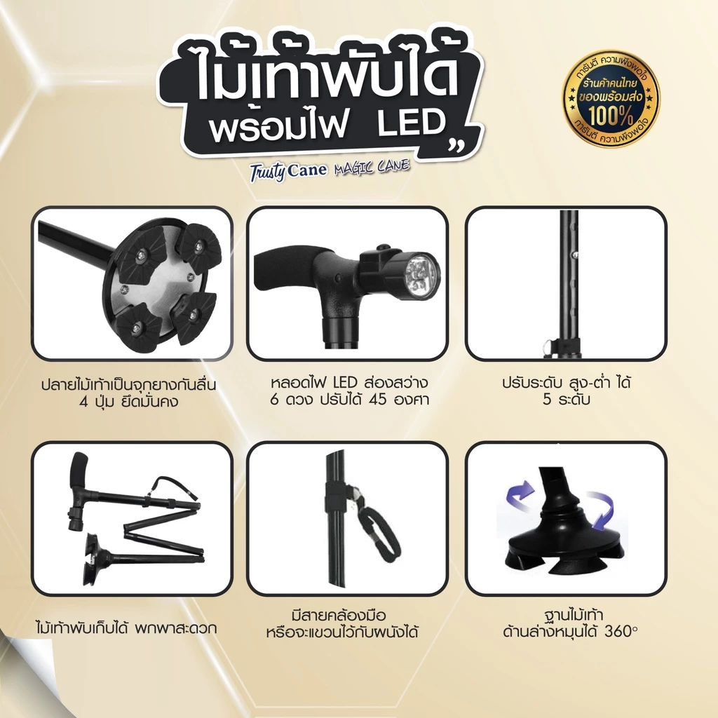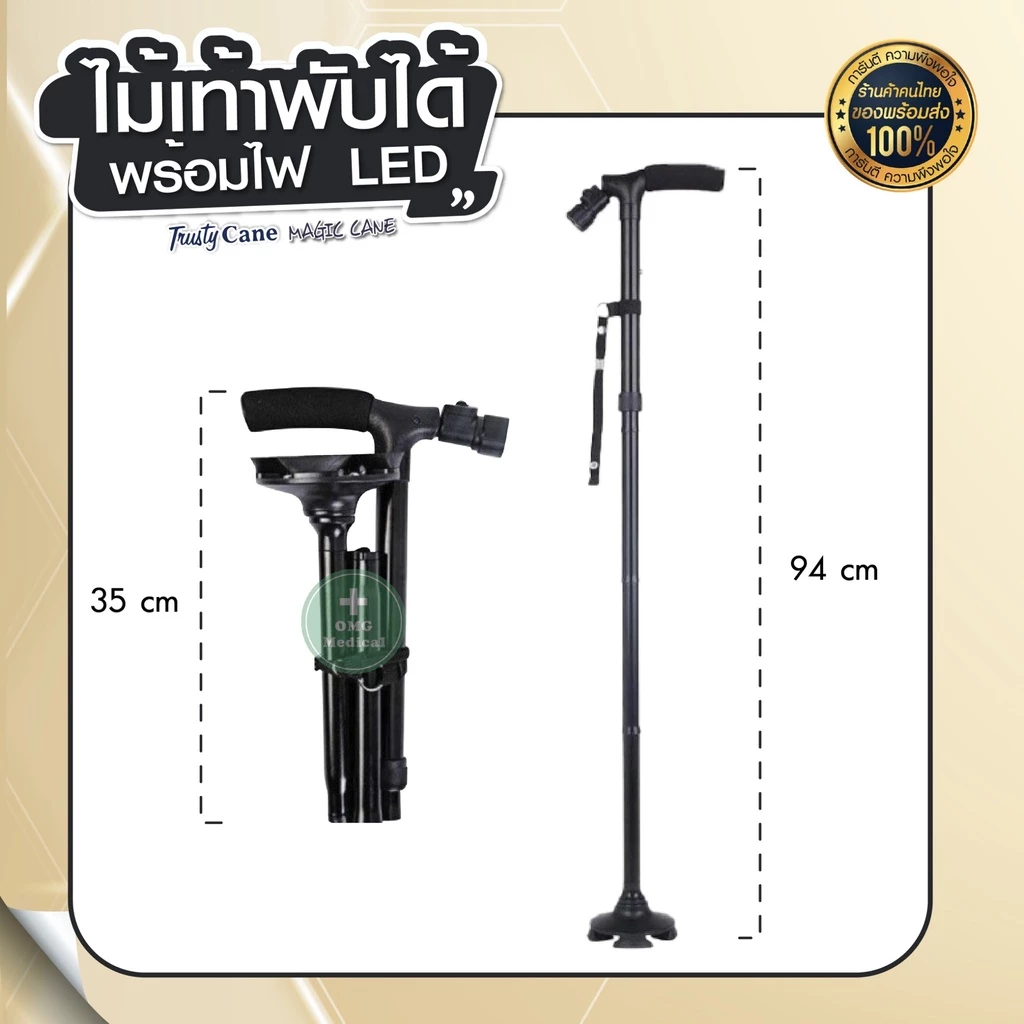 ไม้เท้าพยุงตัวแบบพับได้มาพร้อมไฟฉาย ของแท้ยี่ห้อ Trusty Cane Magic Cane