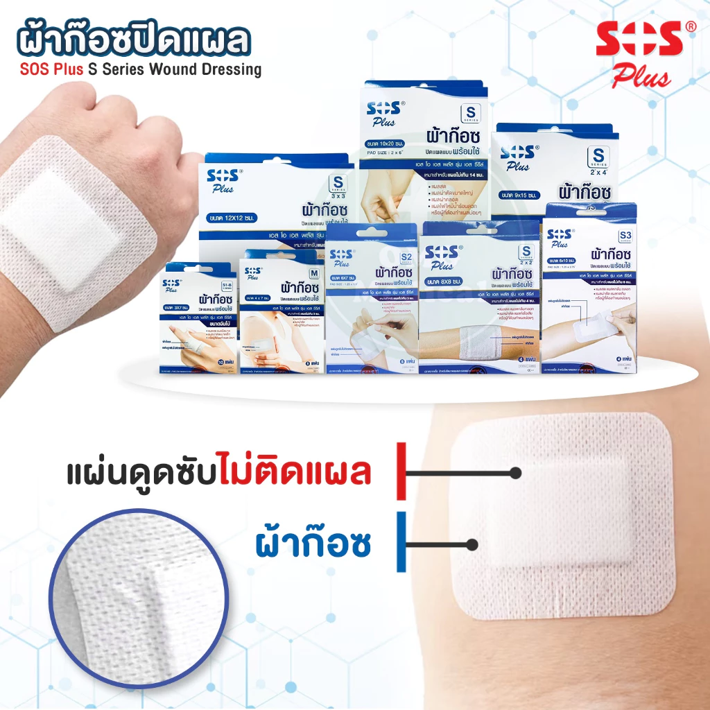 SOS Plus S Series ผ้าก๊อซปิดแผล แบบพร้อมใช้ พร้อมแผ่นดูดซับ S1-B S2 S3 2×2 3×3 2×4 10×20 พลาสเตอร์ปิดแผล ทุกขนาด